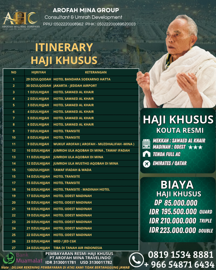 - Total biaya pelunasan mengikuti Regulasi di Tahun Keberangkatan setelah ada pengumuman keberangkatan dari Pemerintah.